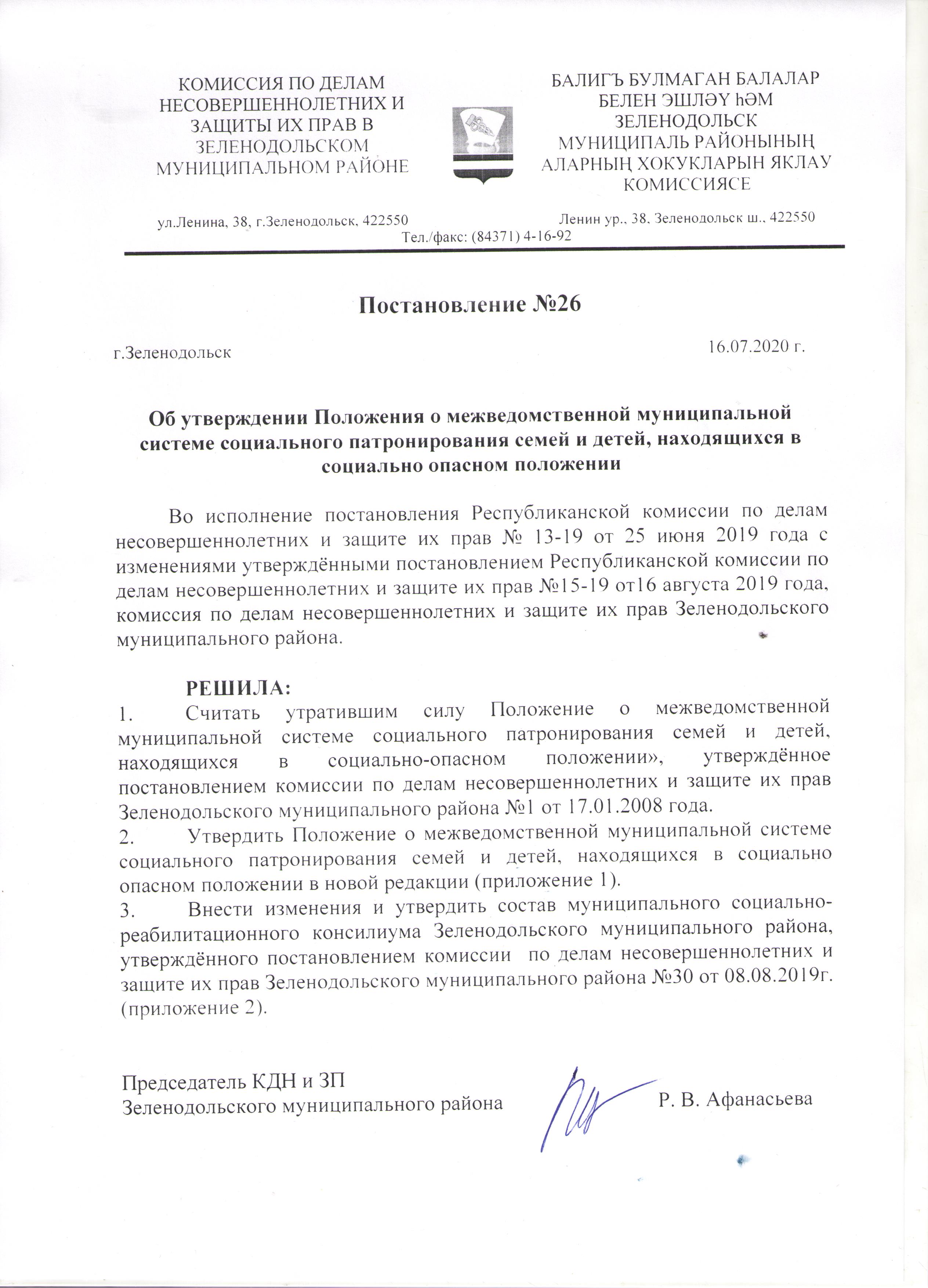 Постановление от 16.07.2020 № 26 "Об утверждении Положения о межведомственной муниципальной системе социального патронирования семей и детей, находящихся в социально опасном положении"