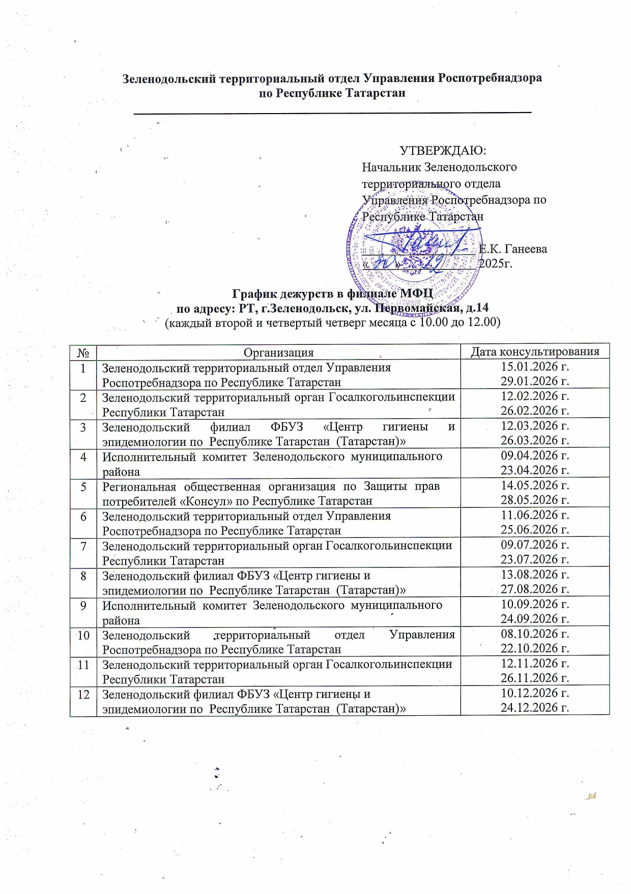 График консультирования в многофункциональном центре предоставления государственных и муниципальных услуг в Зеленодольском районе в 2026 г.