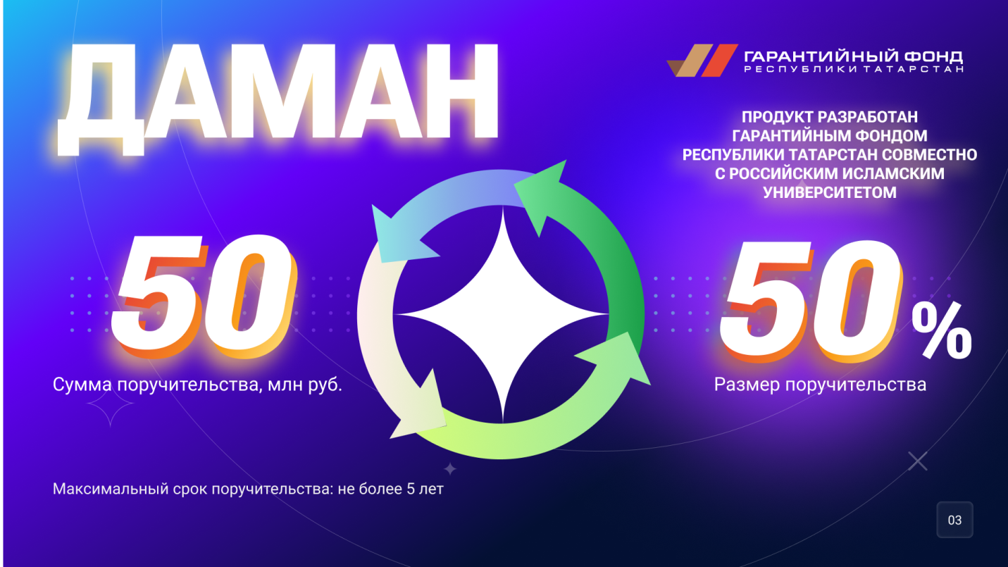 Отметим, что предприниматели Республики Татарстан, придерживающиеся канонов исламского права, также смогут воспользоваться поддержкой Гарантийного фонда Республики Татарстан в соответствии нормами шариата по продукту «Даман».
