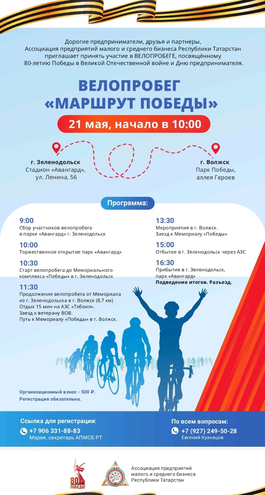 Велопробег «Маршрут Победы» состоится 21 мая. Начало в 10:00 (Зеленодольск от стадиона «Авангард» ул. Ленина, 56 до Волжска Парк Победы, аллея Героев)