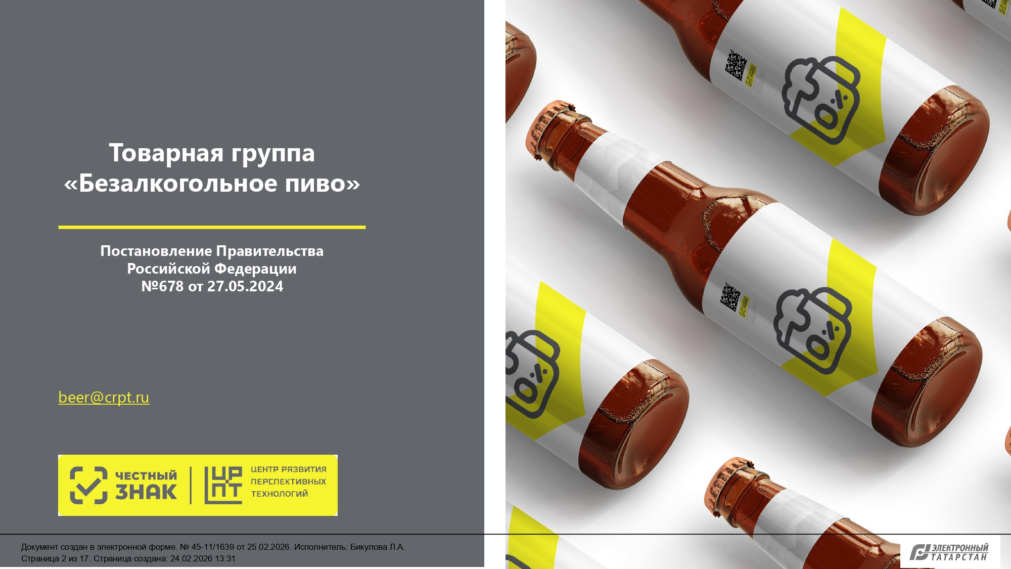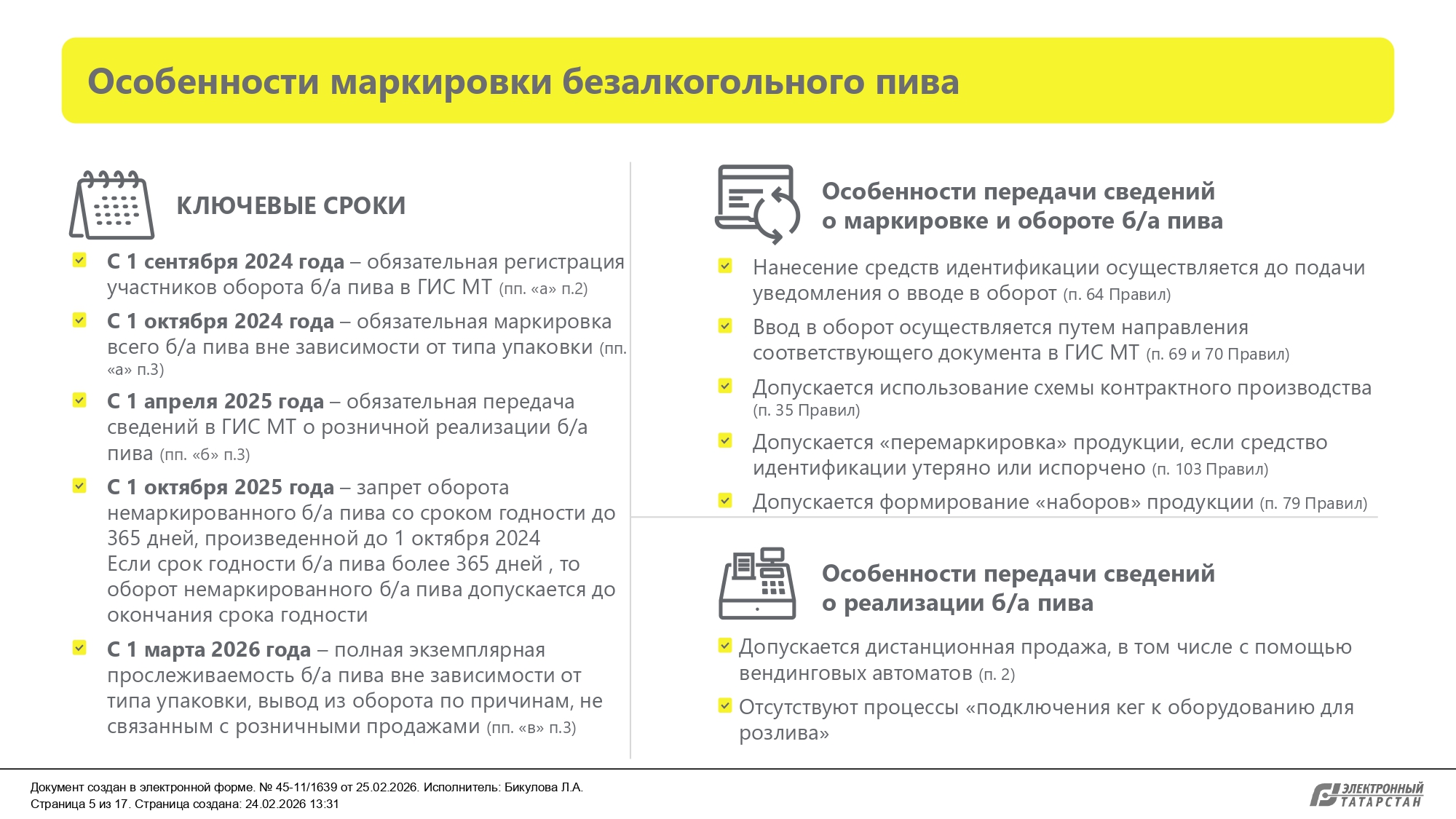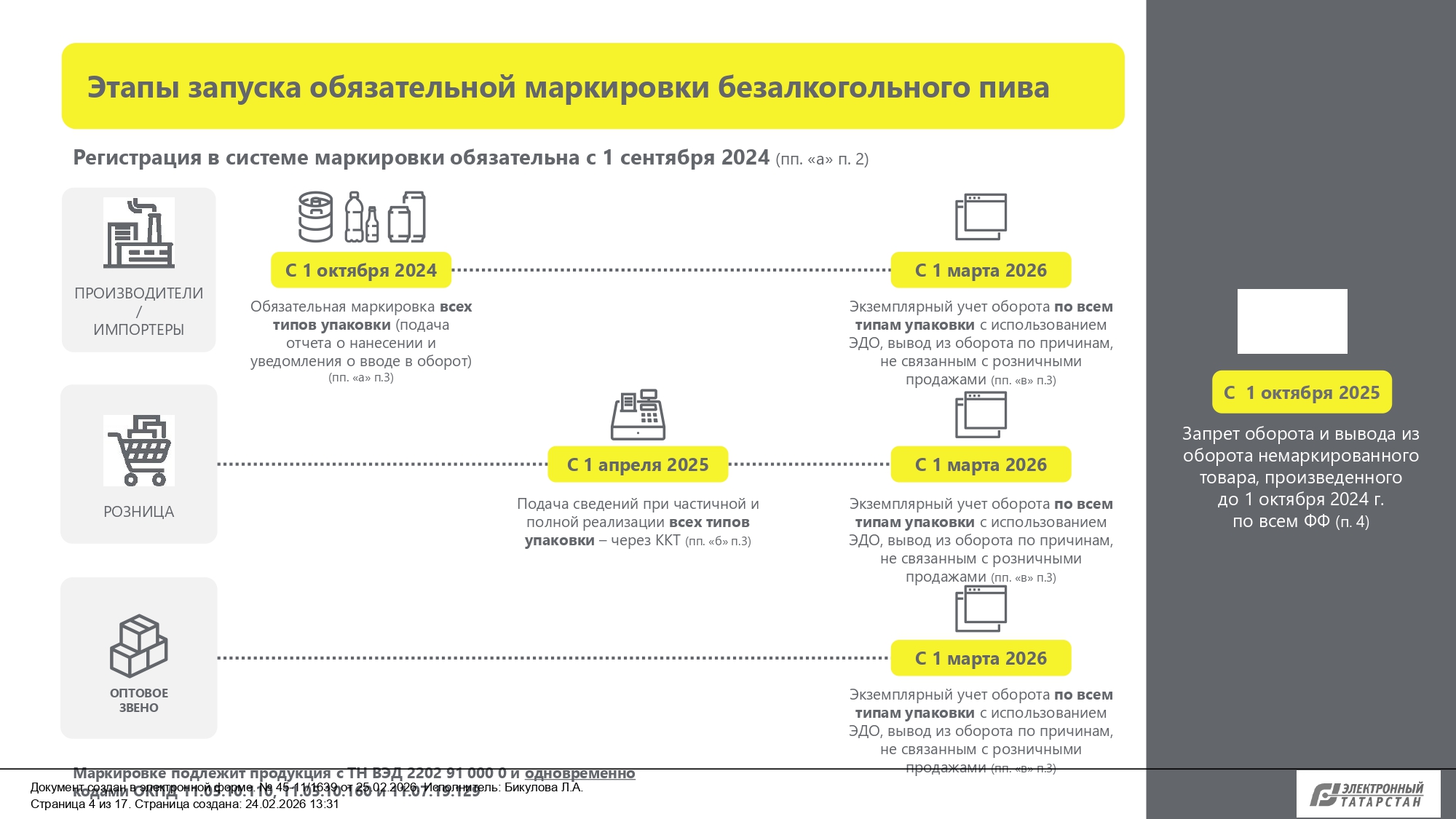 С 01.03.2026 вступают в силу требования о предоставлении в информационной системе маркировки сведений об обороте безалкогольного пива и о выводе из оборота безалкогольного пива путем, не являющимся розничной продажей