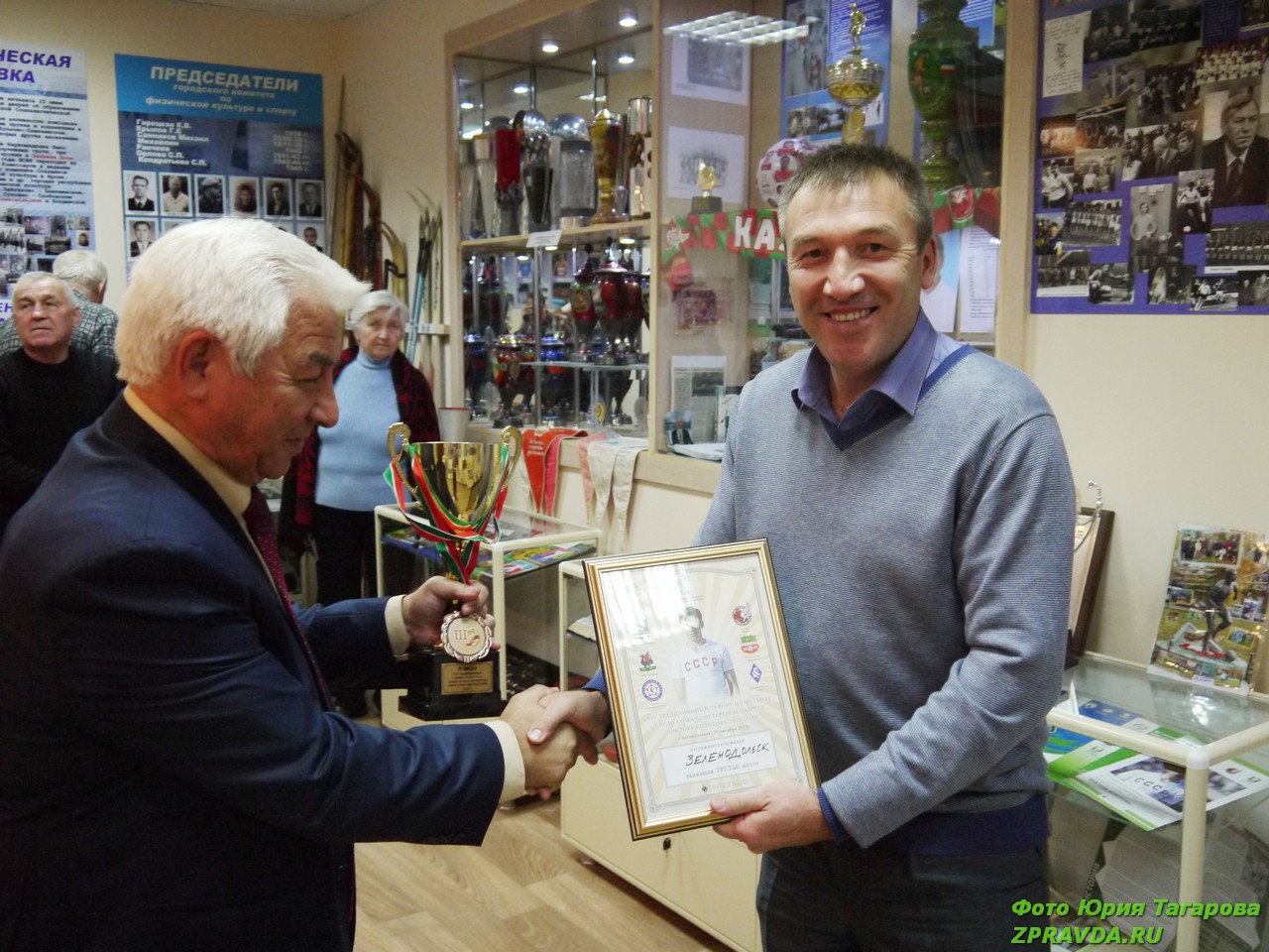 По словам Сергея Саркисяна, специфика музея в том, что здесь нет запасников – всё на стендах. Он призвал директоров ДЮСШ, спортсменов и просто любителей спорта не хранить у себя реликвии, а приносить их в музей. И тогда их увидит огромное количество людей. Пополнение фондов: руководитель Управления по делам молодёжи спорту ЗМР Азат Нигматуллин вручает Сергею Саркисяну Кубок за третье место, только что завоёванный зеленодольскими футболистами в турнире памяти Виктора Колотова