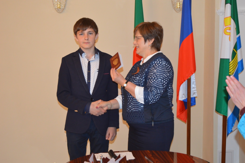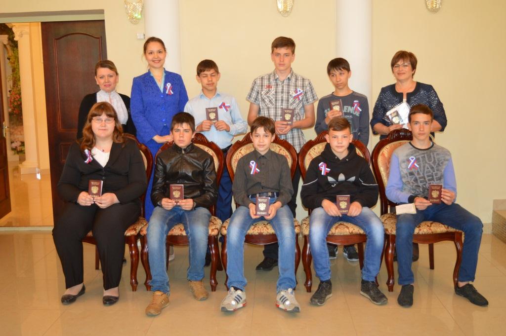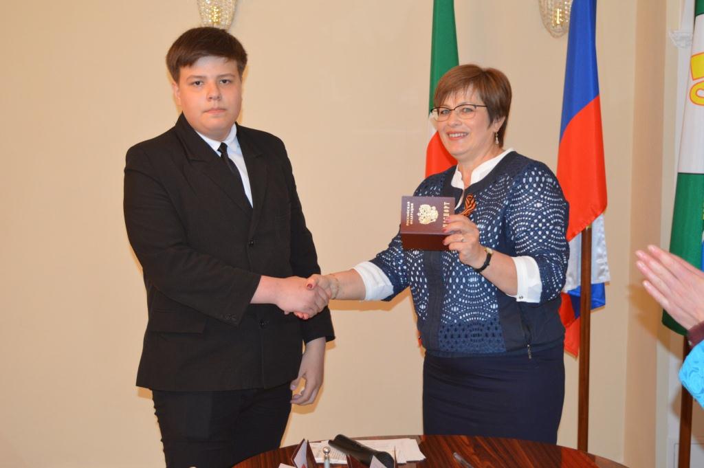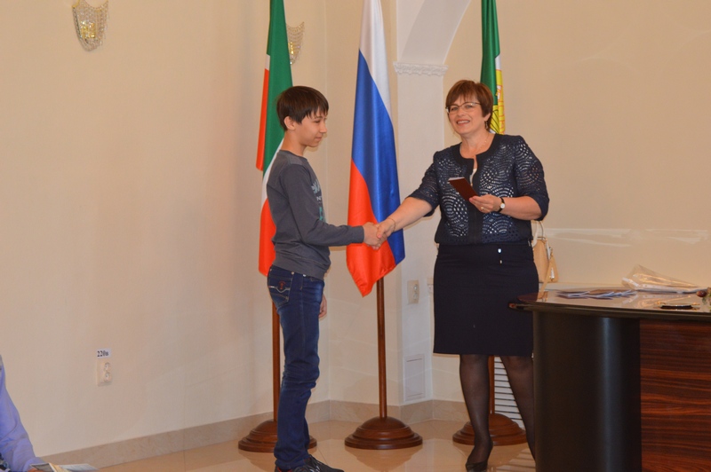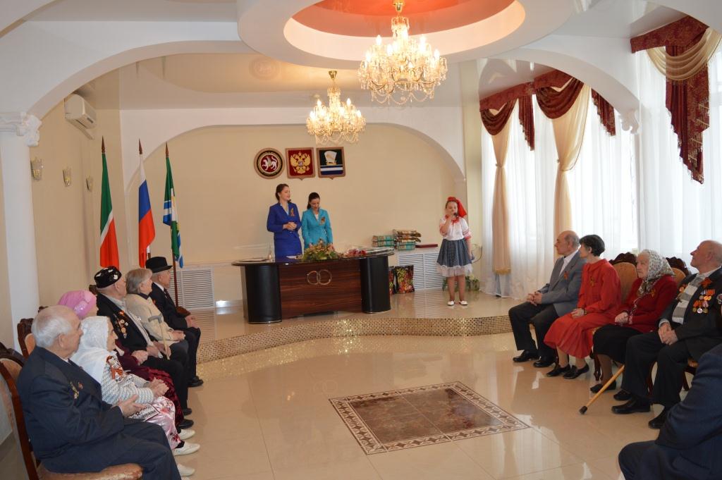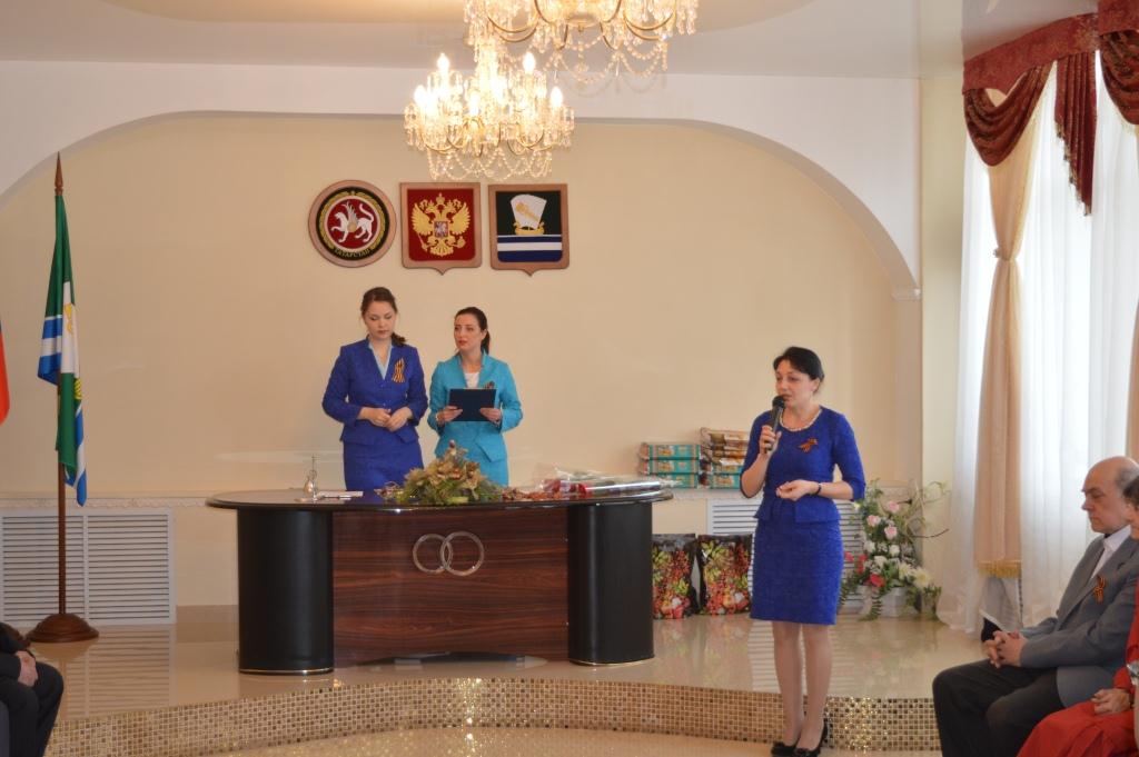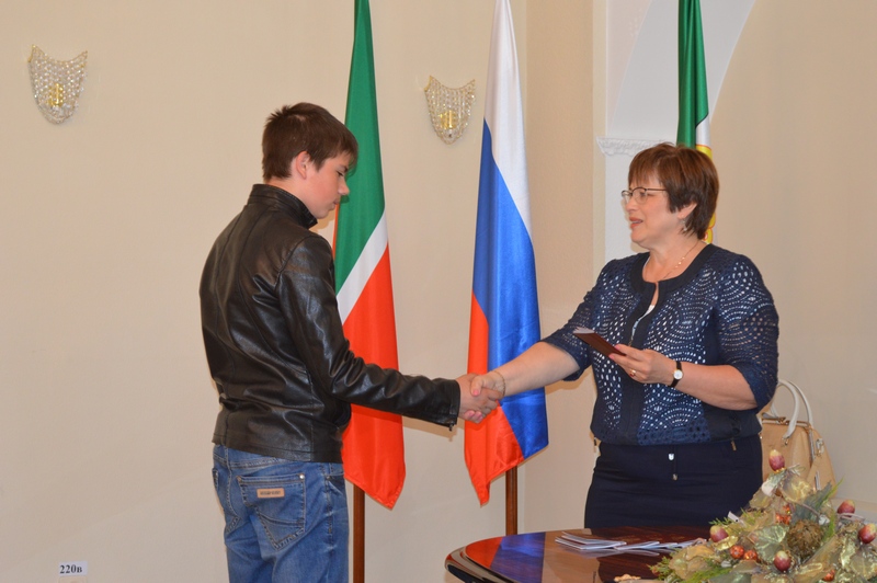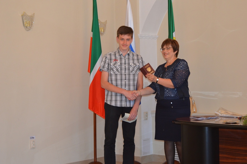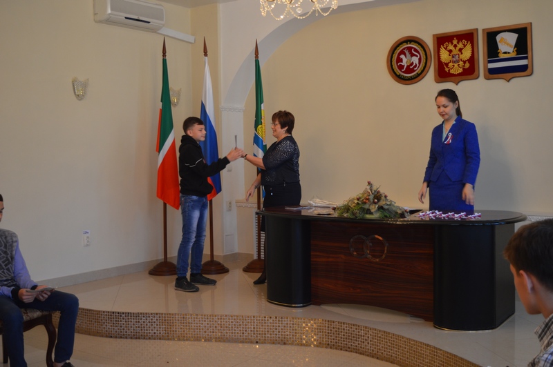 В отделе ЗАГС Исполнительного комитета Зеленодольского муниципального района Республики Татарстан состоялось торжественное вручение паспортов 14-летним гражданам, посвященное празднованию 71-годовщины Победы в Великой Отечественной войне. На праздничном мероприятии присутствовали: член Совета ветеранов МВД России по Зеленодольскому району, ветеран МВД- Гарифуллин Рахимулла Каримович; ветеран боевых действий в Афганистане, член Зеленодольского отделения общественной организации «Боевое братство»- Садреева Наталья Сергеевна; председатель Женского Совета Зеленодольского отделения общественной организации «Боевое братство», вдова погибшего воина -интернационалиста- Бариева Фирая Вагизовна.