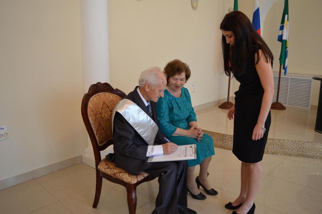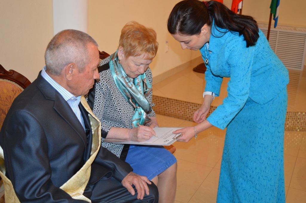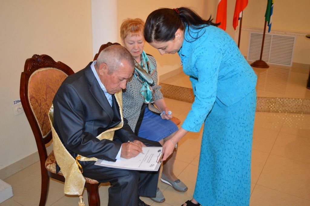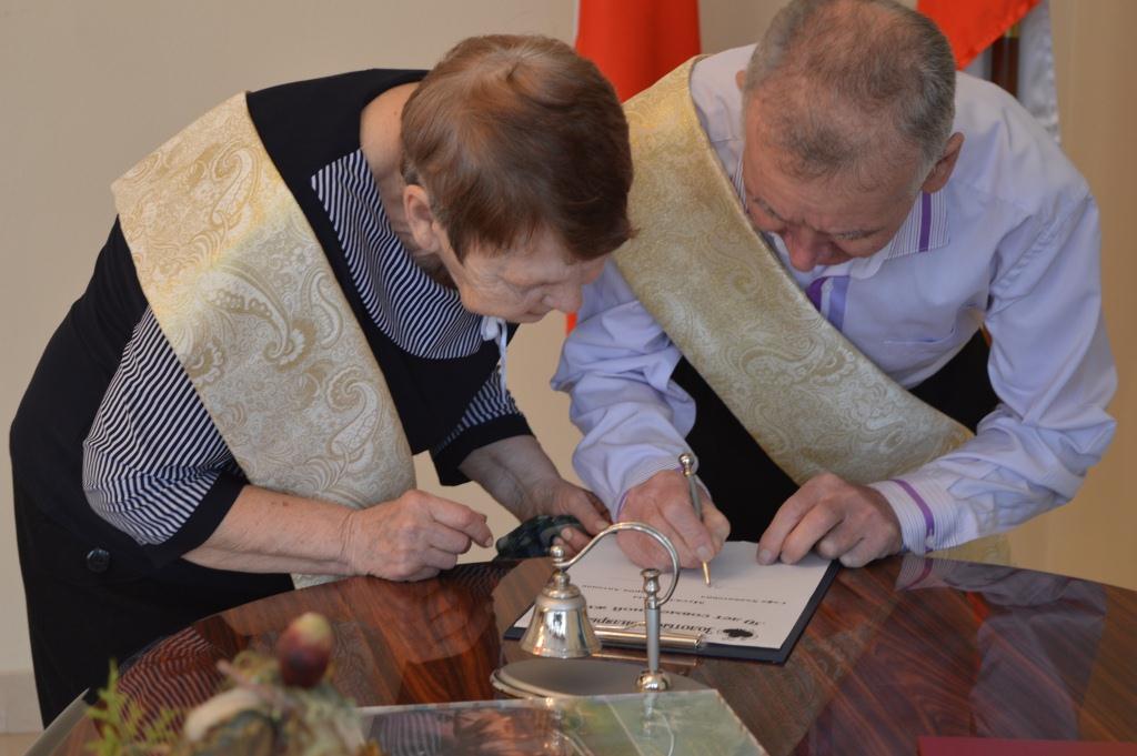 60 ел уртак гаилә тормышы хөрмәтенә Валентин Анатолий улы һәм Антонина Анатолий кызы, “Мактаулы юбилярлар” китабына үзләренең имзаларын куйдылар.