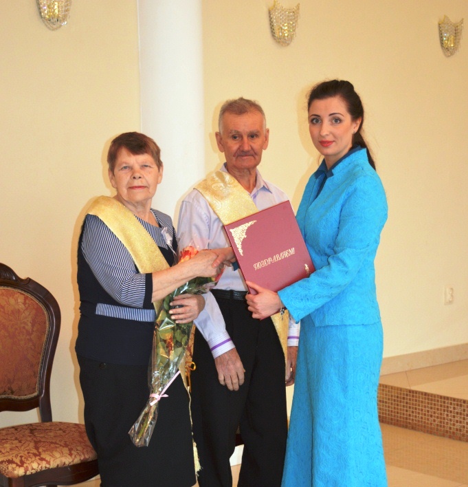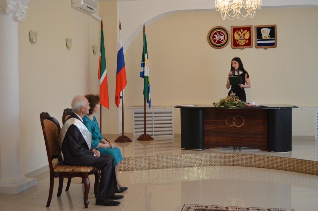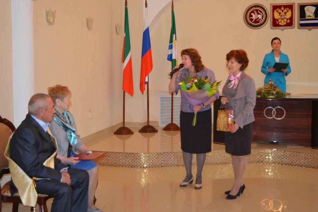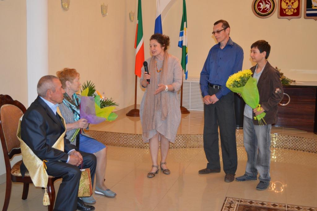 Яшел Үзән шәһәре, Яшел Үзән районы һәм Югары Ослан районнары УПФР башлыгы урынбасары Хафизов Марат Рәис улы юбилярларны котлап, Һәр парга бүләкләр тапшырды, аларга сәламәтлек, бәхет, озын гомер теләп калды