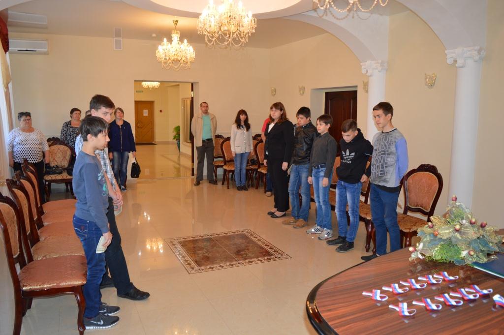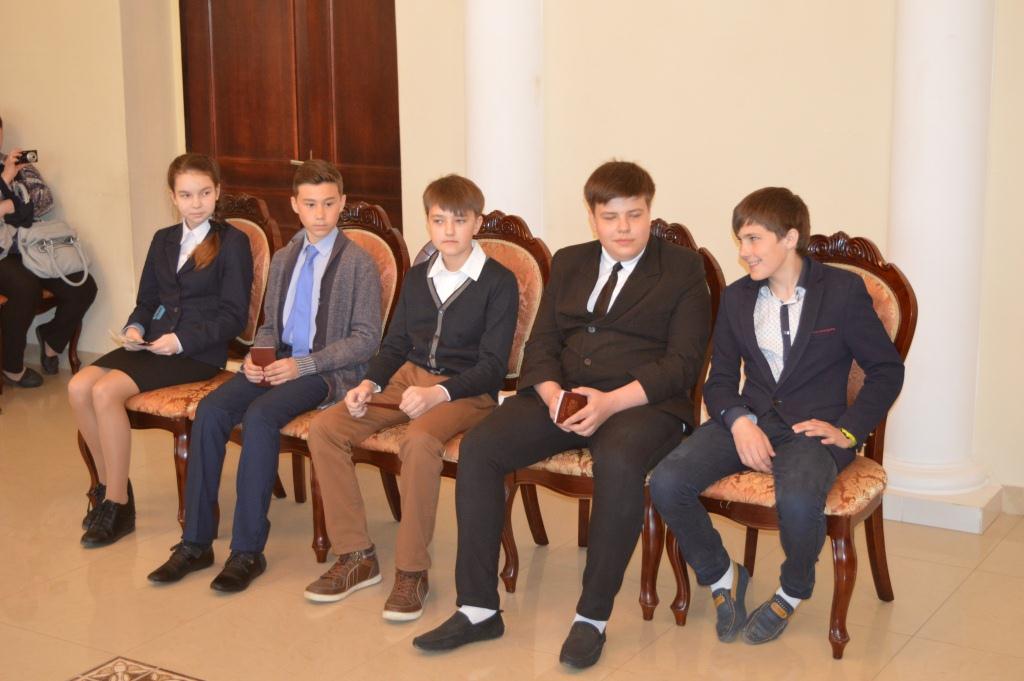 Россия Федерациясе гражданины паспортын тапшыру тантаналы мизгелдә – залда яшьлэрне эти-энилэренэ катнашты. Барлык кунаклар егетлэрне котладылар һәм Россия Федерациясе гражданы исемен аклауларын телэделэр.