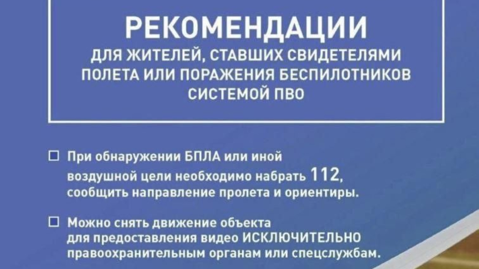 куркынычсыз арага китәргә (биналар, агачлар күләгәсендә ышыкланырга) һәм БПЛА турында полициягә яки гадәттән тыш хәлләр министрлыгына хәбәр итәргә (ашыгыч хезмәтләрне чакыруның бердәм номеры буенча 112 яки яшәү урыны буенча РФ Эчке эшләр министрлыгының дежур бүлегенә хәбәр итәргә)